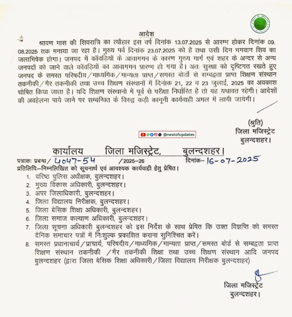 बुलंदशहर: श्रावण मास की शिवरात्रि का पवित्र पर्व 13 जुलाई 2025 से शुरू होकर 9 अगस्त 2025 तक मनाया जा रहा है। इस दौरान मुख्य पर्व 23 जुलाई 2025 को होगा। उस दिन भगवान शिव का जलाभिषेक किया जाएगा। बुलंदशहर में कांवड़ियों के आवागमन को देखते हुए जिला प्रशासन ने सुरक्षा के पुख्ता इंतजाम किए हैं। इसी कड़ी में जिला मजिस्ट्रेट श्रुति ने स्कूलों के बन्द रखने के लिए आदेश जारी किया है।