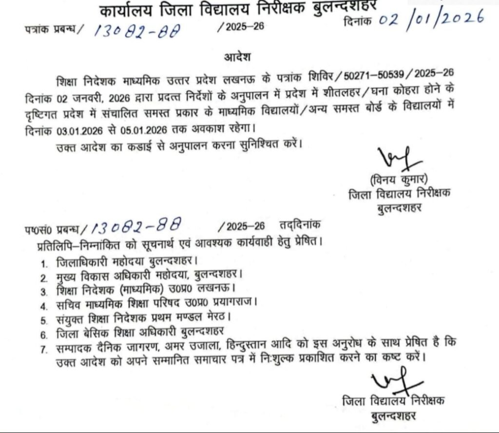 बुलंदशहर: उत्तर प्रदेश में बढ़ती शीतलहर और घने कोहरे के चलते बच्चों की सेहत को ध्यान में रखते हुए बुलंदशहर जिले में बड़ा फैसला लिया गया है। जिलाधिकारी के निर्देश पर जिला विद्यालय निरीक्षक (DIOS) विनय कुमार ने सभी बोर्डों (यूपी बोर्ड, सीबीएसई, आईसीएसई सहित) से संबद्ध कक्षा 12 तक के सरकारी, सहायता प्राप्त और निजी स्कूलों में 2 जनवरी से 5 जनवरी 2026 तक शीतकालीन अवकाश घोषित कर दिया है। इससे पहले बीएसए डॉ. लक्ष्मीकांत पांडेय जिलेभर के परिषदीय विद्यालयों में 14 जनवरी तक स्कूल बंदी का आदेश जारी कर चुके हैं।